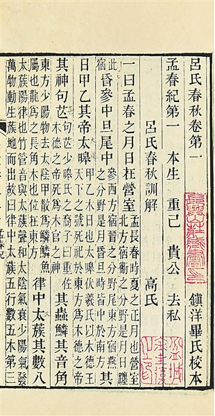 《汉书·艺文志》记载,“左史记言,右史记事,事为《春秋》,言为《尚书》”。以自己的姓氏命名“春秋”,可见吕不韦对《吕氏春秋》这部著作的重视。从形式和内容上来看,《吕氏春秋》如后世学者所言,“以道德为标的,以无为为纲纪”。该书由八览、六论、十二纪组成,其中十二纪对应一年十二月令,自孟春起,至季冬止,隐喻天时和人事之间的关系,又暗合阴阳五行之说,无愧杂家学说之代表作。
