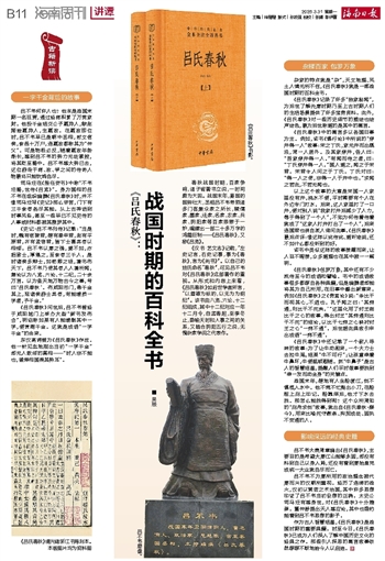 ■ 吴辰春秋战国时期,百家争鸣,诸子皆著书立说,一时间蔚为大观。战国末年,秦国的国势壮大,丞相吕不韦带领诸多门客集众家之所长,糅儒家、墨家、法家、名家、农家、兵家、阴阳家等百家思想于一炉,编撰出一部二十多万字的鸿篇巨制——《吕氏春秋》,又称《吕览》。
