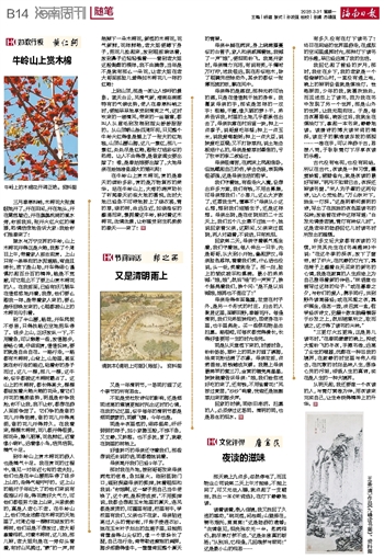 上到山顶,那是一派让人惊呼的景象。蓝天白云,风清气新,海南岛南部特有的气候优势,使人在春寒料峭之时,便能早早地享受到清爽之气,这时吹来的一缕清风,带来的一丝暖意,都叫人从眉毛到发梢到指尖舒舒服服的。从山顶朝山脉四周环视,只见整个牛岭火红得像是铺上了一张大的红地毯,山顶山腰山脚,这儿一簇红,那儿一簇红,处处尽是红艳,跟张灯结彩似的热闹。让人不由得想,是谁家闺女要出嫁了?哦,是春姑娘要出嫁了,大地母亲在给她准备盛大的婚礼呢!
