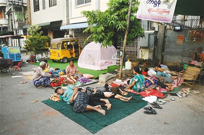 4月4日,人们在缅甸曼德勒街头休息。新华社发