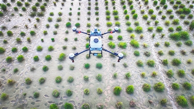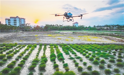 近日,在三亚崖州区国家野生稻种质资源圃物种展示区,在科技人员操控下,无人机对野生稻进行精准施肥。