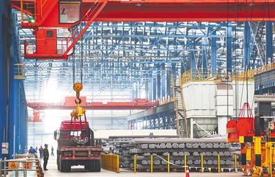 河钢集团石钢公司的工人在吊装钢材准备运输(资料图)。 新华社发