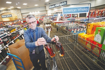 在加拿大温哥华,一家酒类专卖店的店员从货架上撤下美国酒类产品(资料图)。新华社发