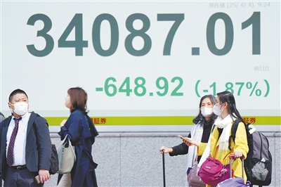 4月4日,行人经过日本东京一处股指显示屏。受美国政府宣布的“对等关税”影响,日本东京股市两大股指持续大幅下跌。