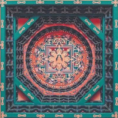 藻井的构图多采用二方连续(亦称带状图案)的形式,形成灵动造型,既点缀了庄严殿堂,也折射出人间繁华。其布局通常有三层:井心——边饰——帷幔,外圆内方、居中对称、层层嵌套,营造出强烈的纵深感和层次感。在配色方面,藻井常用互补色对比,如红绿对比,鲜艳浓烈,给人热情洋溢、充满活力的观感。同时,加入黑、白、灰、金等中性调和色,使整体色彩更为和谐。比如,“三兔共耳”藻井以白色垂角纹边饰与主体色彩衔接,形成渐变效果,增强了画面的立体感。