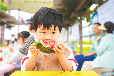 参与研学采摘活动的孩子品尝新品种西瓜。