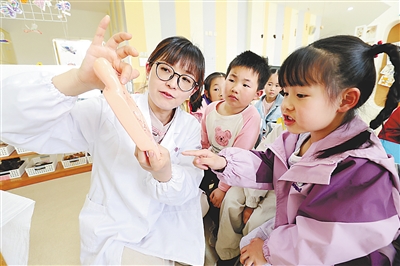图为在浙江省湖州市德清县三桥幼儿园,德清县中医院医生给孩子讲解中医针灸穴位知识。新华社发