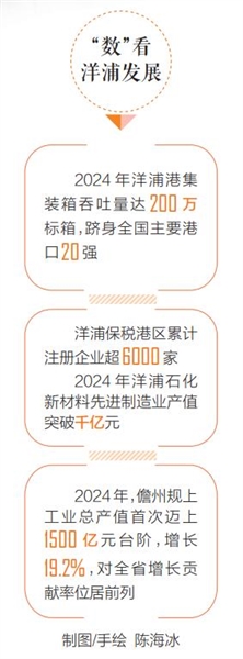 船只往来停靠,集装箱进进出出……如今的洋浦港热闹非凡,2024年集装箱吞吐量达200万标箱,跻身全国主要港口20强。
