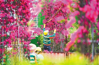 4月7日,在海南国际会展中心周边,园林工人放置花开正艳的三角梅。
