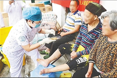 邢少云(左一)给麻风病患者进行护理。海南省第五人民医院供图