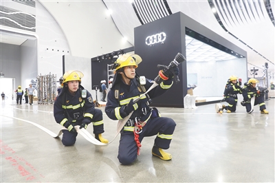 4月9日,海口市消防救援支队现场安保团队在海南国际会展中心举行消防演练。