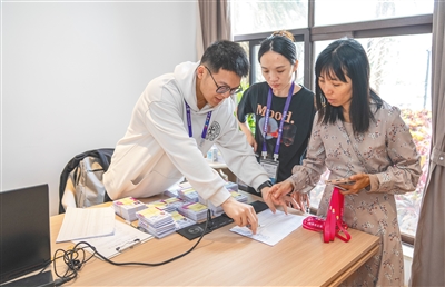 4月9日,海口良智海景大酒店,参加消博会的媒体记者领取证件及相关物料。