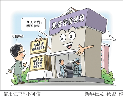 AAA级信用等级证书、AAA级质量服务诚信单位、AAA级诚信经营示范单位……一些企业拥有各类信用证书,这些证书真的可信吗?据新华社记者调查发现,企业信用评价市场鱼龙混杂,一些机构两三个人加一台打印机就能“出证”,“今天交钱,明天拿证”“多交钱多办证”。信用证书,作为信用凭证,本是企业的“金字招牌”。可是,当信用看钱办证,快交钱快办证,多交钱多办证时,信用证书也就成了某些机构的“提线木偶”,难以发挥出应有作用。信用社会,容不得投机取巧,必须严刹交钱“办证”就能秒变信用“优等生”的无良做法,让信用真正信得过、有含金量,成为无价之宝。