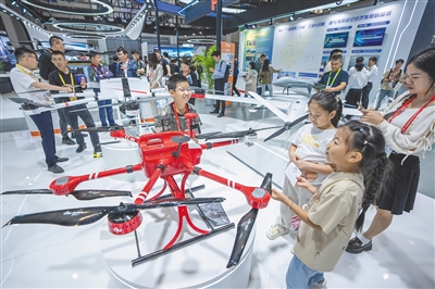 四月十三日,在第五届中国国际消费品博览会消费科技展区的低空经济展示专区,吸引小朋友参观。海南日报全媒体记者 李天平 摄