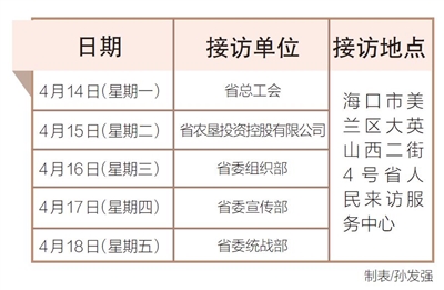 4月14日至18日,省总工会、省农垦投资控股有限公司、省委组织部、省委宣传部、省委统战部相关负责人将在海口市美兰区大英山西二街4号省人民来访服务中心接访群众。