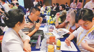 参展商和采购商在消博会供需对接会(国别专场)现场深入交流。