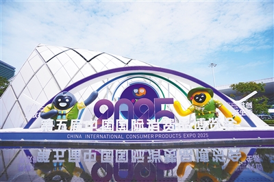海南国际会展中心外,第五届中国国际消费品博览会巨型标识。海南日报全媒体记者 王程龙 摄