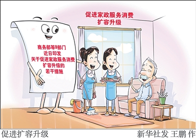 新华社北京4月18日电 (记者张晓洁 谢希瑶)商务部等9部门近日印发关于促进家政服务消费扩容升级的若干措施,4月18日对外发布。一系列举措围绕提升家政服务供给质量、促进家政服务便利消费、完善家政服务业支持政策、优化家政服务消费环境等4方面展开,促进家政服务消费扩容升级。其中,明确提出鼓励家政服务企业拓展专业深度保洁、室内空气治理、营养咨询等新兴服务领域,加强与装修、家居等行业跨界融合发展。以社区网点为依托,发掘“微需求”,提供“微服务”,满足消费者共享保洁、烹饪、接送等家政服务需求。引导家政服务企业和家政服务人员依法参加社会保险,推动符合条件的灵活就业家政服务人员在就业地参加社会保险。建立健全常态化、多元化家政服务纠纷调解机制,营造良好行业发展环境。