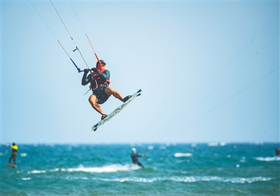 4月19日,琼海市博鳌海滨,风筝冲浪爱好者在海面上踏浪而起。时下正是风筝冲浪的黄金季节,琼海博鳌因其独特的季风和海滨风光,吸引了众多游人前来体验风筝冲浪。