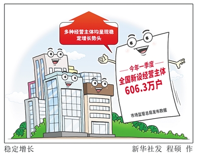 据新华社北京4月21日电(记者赵文君)市场监管总局21日发布数据,今年一季度,全国新设经营主体606.3万户。其中,新设企业210万户,新设个体工商户394.9万户,新设农民专业合作社1.4万户,多种经营主体均呈现稳定增长势头。