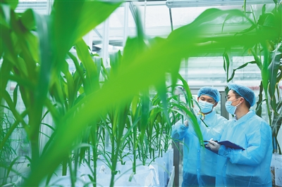 近日,全球动植物种质资源引进中转基地隔离检疫圃内,工作人员察看玉米植株幼苗长势。