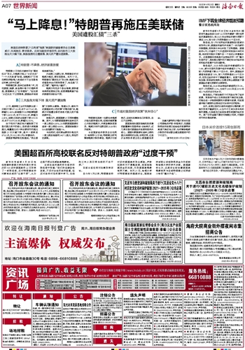 美国总统特朗普21日再度“炮轰”美国联邦储备委员会主席鲍威尔,向其施压、要求降息。此举加剧投资者担忧,纽约股市三大股指当天大幅下挫,美国国债同日遭抛售、美元资产遭加速抛售。A