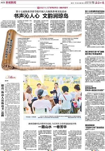 在第30个世界读书日到来之际,4月23日,第十七届海南书香节启动仪式暨国际数字出版产业创新联盟揭牌仪式在澄迈举行。今年的海南书香节,传递出一个鲜明指向,就是厚植本土文化,提升琼版精品阅读率与影响力,概括来说,那就是进一步擦亮“海南人读海南书”品牌。