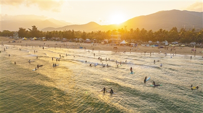 4月23日,在万宁日月湾,游客们学习冲浪,享受着惬意无比的海边生活。