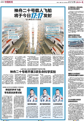 按计划,神舟二十号载人飞船入轨后,将采用自主快速交会对接模式,约6.5小时后对接于天和核心舱径向端口,形成三船三舱组合体。在轨驻留期间,神舟二十号航天员乘组将迎来天舟九号货运飞船和神舟二十一号载人飞船的来访,计划于今年10月下旬返回东风着陆场。