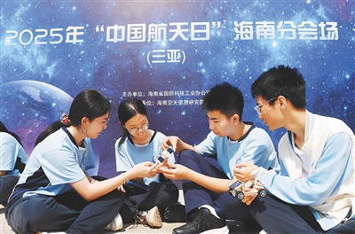 图为上海外国语大学三亚附属中学的学生在组装太阳能卫星和火星探险车模型。