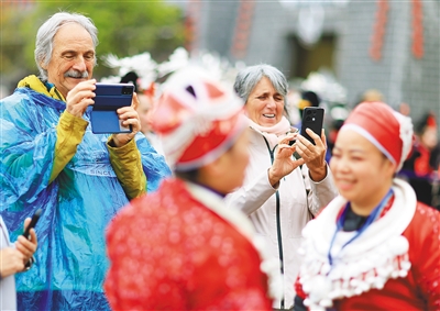 外国游客在贵州省黔东南苗族侗族自治州台江县庆祝活动上拍摄。新华社发