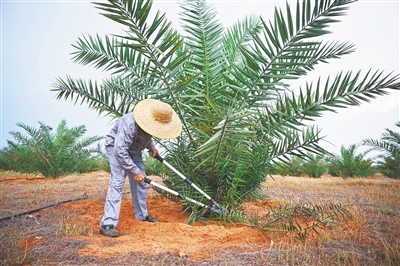 近日,经过科研人员精心管护,位于文昌的中国热带农业科学院椰子研究所(简称中国热科院椰子所)椰枣种质资源圃内的部分椰枣已结出幼果。2021年至2024年,阿联酋先后分两批向中国赠送椰枣苗共计2.5万株。作为具体实施单位,中国热科院椰子所接收了这些椰枣苗,逐步建成了椰枣种质资源圃。新华社记者 蒲晓旭 摄