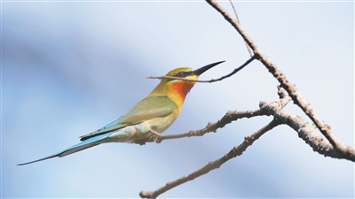近日,位于东方市四更镇的海南黑脸琵鹭省级自然保护区内,栗喉蜂虎在树上停歇。