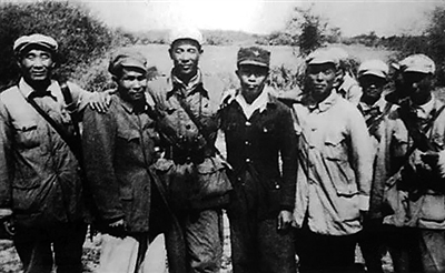 苟在松(右)率部登陆后与负责接应的琼纵政治部副主任陈青山(左)合影。
