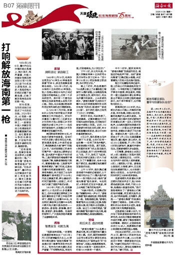 ■ 海南日报全媒体记者 吴心怡1950年3月6日,儋州市白马井镇的超头海滩上,炮火连天、枪声隆隆,中国人民解放军第四野战军40军118师352团799名战士渡海而来,在敌人海陆空炮火的疯狂拦截下奋勇抢滩,打响了解放海南岛战役的第一枪。