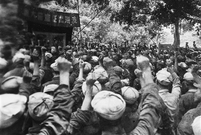 1950年3月,我军准备潜渡登岛的先锋营全体指战员参加动员大会并集体宣誓。 (资料图)