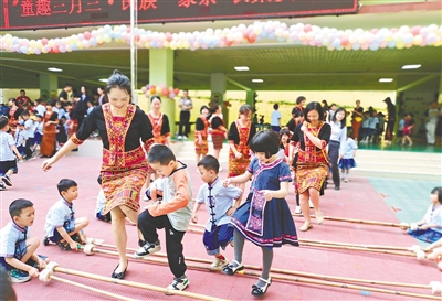 为传承民族文化,织黎锦、烹饪三色饭等民族特色活动,被植入幼儿园一日活动中;孩子们玩的高跷、独轮车、竹蜻蜓等玩具都是就地取材制作的;斗笠和椰壳成了孩子们早操时的游戏道具;孩子们用脚丫将泥巴踩软,在幼儿园里造了一座微型船形屋……水满中心幼儿园园长黎娜欣喜地看到,当讨论种植水稻有哪些步骤时,孩子们纷纷高举小手,争先恐后地分享自己的看法。