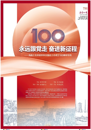 海南各级工会联合海南日报推出《永远跟党走 奋进新征程——海南工会庆祝中华全国总工会成立100周年特刊》,展示全省各级工会的工作亮点,在全省营造起职工群众投身海南自贸港建设的热烈氛围,为奋力谱写中国式现代化海南篇章贡献工会力量。