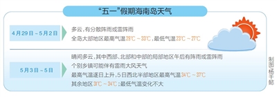 本报海口4月29日讯(海南日报全媒体记者陈婧 通讯员林俊汝 李凡 吴春娃)记者4月29日从海南省气象台了解到, 预计“五一”假期,海南岛大部分时段以多云天气为主,午后有短时阵雨或雷阵雨,总体适宜出游;户外活动需做好防晒,及时关注天气预警信息。具体来看,陆地方面,4月29日~5月2日,海南岛多云,有分散阵雨或雷阵雨。全岛大部地区最高气温29℃~33℃,最低气温23℃~27℃。 5月3日~5日,海南岛晴间多云,其中西部、北部和中部的局部地区午后有阵雨或雷阵雨,个别乡镇可能伴有雷雨大风天气。最高气温逐日上升,5日西北半部地区最高气温34℃~37℃,其余地区31℃~34℃;最低气温变化不大。