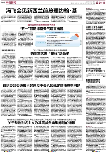 会议还对“五一”假期安全生产、保供稳价等工作进行部署,要求聚焦道路交通、涉海旅游、琼州海峡轮渡等重点领域,加强值班值守和工作调度,牢牢守住安全底线。