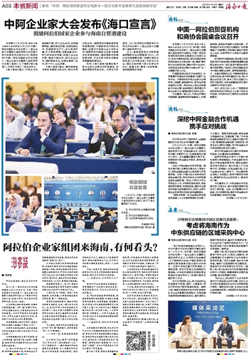 同时,《海口宣言》强调加强中阿企业家大会等合作机制建设,加强法律服务机构交流。中阿双方还商定,2027年在阿拉伯国家举办中阿合作论坛第十二届企业家大会暨第十届投资研讨会。