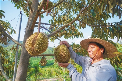 乐东琛源农业公司榴莲基地的错峰榴莲试种成功,农户举起榴莲开心不已。