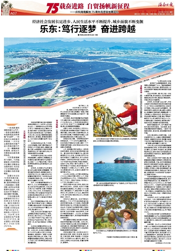 不同时期的两组数据的对比可以反映出乐东的变化。据《乐东县志》记载:20世纪50年代初期,乐东农业总产值1000余万元,财政收入不足80万元。2024年,乐东全县地区生产总值达227.57亿元,城乡居民人均可支配收入37438元和21575元。