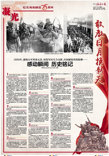 海南岛解放后,1950年5月中旬,海南各地、各行业纷纷成立庆祝海南解放筹备会。6月5 日,府海地区各界人民隆重举行庆祝海南解放大会,参加庆祝大会的有机关、团体及学校83个单位共3万人。邓华、冯白驹等出席大会,各界代表向邓华、冯白驹和解放军战士代表献花。