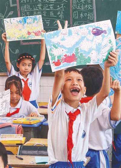 三亚市天涯小学,学生们在课堂上手绘海洋动物,学习海洋环保知识。(资料图)