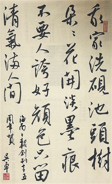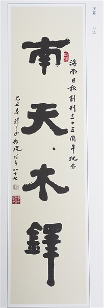 祖籍海南文昌的著名书法碑学理论家祝嘉,生前长期旅居苏州,但他心系故土。1985年《海南日报》创刊35周年,当时已经87岁的他精心题写“南天木铎”4字,取“木铎金声”之意蕴,表达对《海南日报》的肯定和期许。当代书坛名家吴东民为海南万宁人,曾于2010年《海南日报》创刊60周年之际,以行云流水、潇洒俊逸之笔书写王之涣诗一首,祝愿《海南日报》“更上一层楼”。曾给《海南日报》“庆生”的还有书法家陈振濂、何应辉,他们以灵动的笔触书写古诗以表祝贺。书法家周俊杰则以浑厚的线条写下“南海声雷震万方”,称赞《海南日报》不俗的影响力。