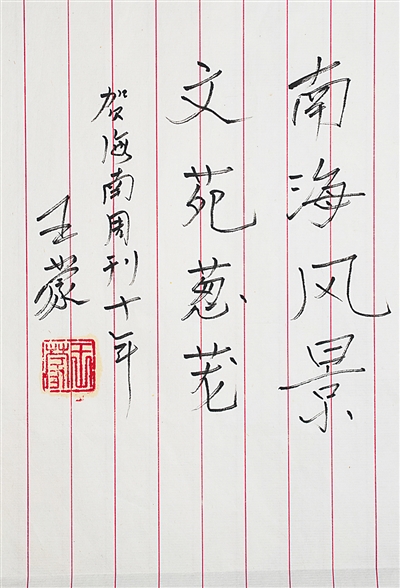 2018年海南日报《海南周刊》创刊10周年,著名作家王蒙曾写下“南海风景 文苑葱茏”8字寄语。在旧式信笺上,他的笔迹坚秀刚逸,透着清雅的文人气息。海南临高人、著名徽学专家叶显恩曾受邀回琼参加海南日报社举办的文化活动,写下“发掘海南地区优秀文化,充当思想文化高地守护者”的寄语。名家、学者以翰墨深情寄语,彰显了《海南日报》的文化品格和影响力。