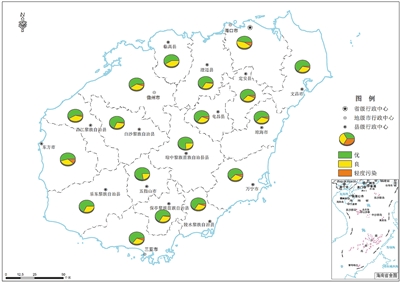 全省地表水水质总体为优,192个1省控监测断面(点位)的水质优良(Ⅰ~Ⅲ类)比例为96.4%,同比持平;无劣Ⅴ类断面,同比持平。19个市县中,文昌市水质轻度污染,东方市水质良好,其余市县水质为优。
