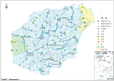 省控河流水质为优,水质优良比例为96.5%,Ⅳ类比例为2.1%,Ⅴ类比例为1.4%,无劣Ⅴ类断面。南渡江、昌化江、万泉河流域和西北部、南部、南海各岛诸河水质为优,东北部诸河水质良好。142个监测断面中,文昌市珠溪河河口和保亭县保亭水新星农场断面水质中度污染;东方市罗带河罗带铁路桥、文昌市文教河坡柳水闸、万宁市东山河后山村等3个断面水质轻度污染,其余断面水质优良。超Ⅲ类水质断面主要污染指标为总磷、高锰酸盐指数、化学需氧量,断面超标率分别为2.1%、2.1%、1.4%。