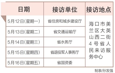 5月12日至16日,省住房和城乡建设厅、省交通运输厅、省水务厅、省退役军人事务厅、省国资委相关负责人将在海口市美兰区大英山西二街4号省人民来访服务中心接访群众。